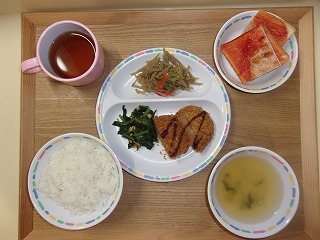 献立・まぐろカツ・ほうれん草のなめたけ和え・高野豆腐の卵とじ おやつ・マリー(幼)・ムーン...