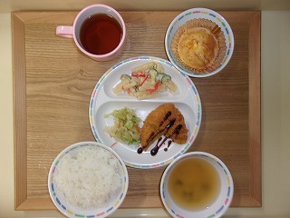 献立・旨じゃがかぼちゃコロッケ・マカロニサラダ・キャベツのおかか和え・味噌汁(玉ねぎ・わかめ)&nb...