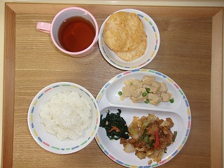献立・豚肉とキャベツの味噌炒め・ほうれん草の納豆和え・高野豆腐の卵とじ おやつ・まがりせん...