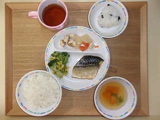 献立・オムライス・もみの木型ハンバーグ・南瓜サラダ・ブロッコリーのお浸し・コンソメスープ(白菜・わか...