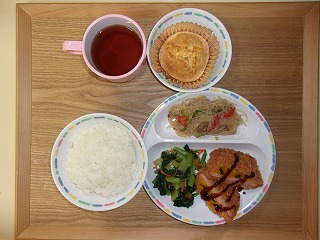 献立・かぼちゃクリームハムカツ・小松菜のおかか和え・チャプチェ おやつ・みかんマフィン ...