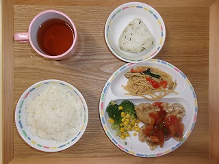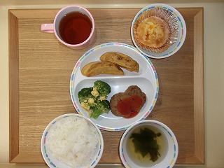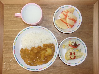 献立・秋野菜カレー・ツナサラダ・ほうれん草オムレツ おやつ・マリー(幼)・ムーンライト(乳...