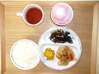 献立*なかよしメニュー*・鶏肉の竜田揚げ・ほうれん草とコーンのお浸し・南瓜の煮付け おや...