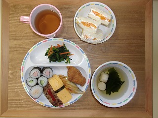 献立*お誕生日会メニュー*・お寿司盛り合わせ・ほうれん草のお浸し・すまし汁(おつゆ麩・わかめ)&nb...