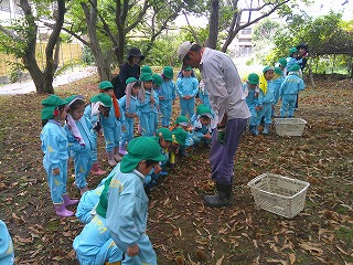ふれあい農園に行って、栗ひろいをしました。栗林の中に入ると「わぁー!栗がいっぱい!」と大喜びの子ども...