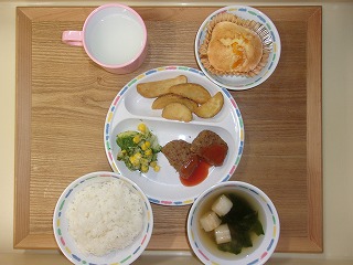 献立・ふわふわハンバーグ・フライドポテト・ブロッコリーとコーンのサラダ・味噌汁(おつゆ麩・わかめ)...