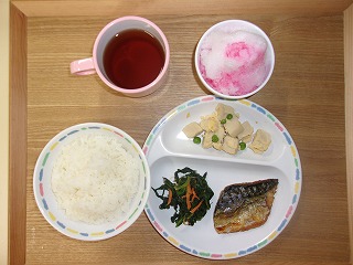 献立・和食の定番 鯖の塩焼き・ほうれん草のおかか和え・高野豆腐の卵とじ おやつ・かき氷(...