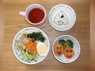 献立・冷やしうどん・ブロッコリーのお浸し・チキンナゲット おやつ・わかめごはんおにぎり ...