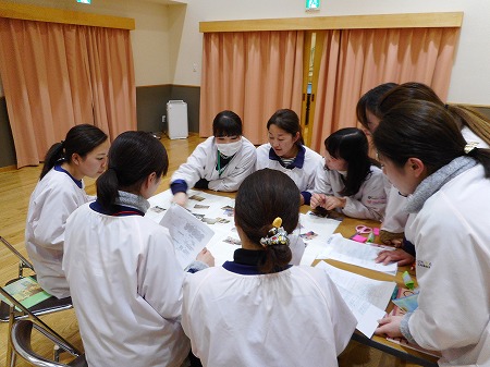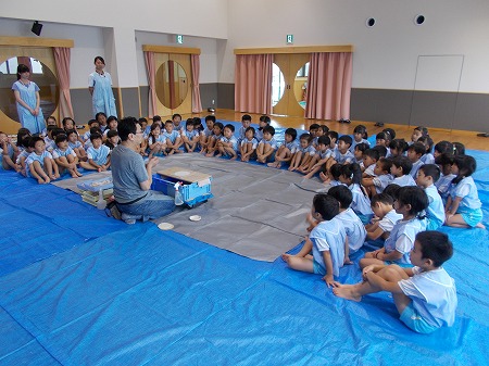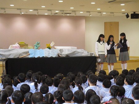 大宅中学校家庭科部のお姉さんたちがこども園のホールで人形劇をしてくださいました。「ともだちや」という...