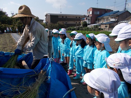 6月に植えた苗が子どもたちの背丈より大きくなって驚いていたゆり組の子ども。畑の先生と一緒に稲刈りをし...